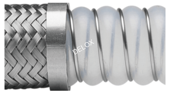 淺波紋設計的PTFE軟管Croflex?,符合FDA食品和USPVI制藥級要求,加螺旋鋼絲和不銹鋼編織網增強。淺波紋對流量的影響很小,更易于排水和清洗,適合潔凈物料的輸送和抽吸。Croflex?軟管耐高溫,耐強腐蝕,加厚PTFE帶來更強的抗滲透性,使工作壽命延長。可將PTFE翻邊于接頭密封面,防止物料對PTFE以外物質的腐蝕風險。中層螺旋鋼絲環繞在PTFE軟管波紋處,可有效防止折癟,并可增強高溫下耐負壓能力。